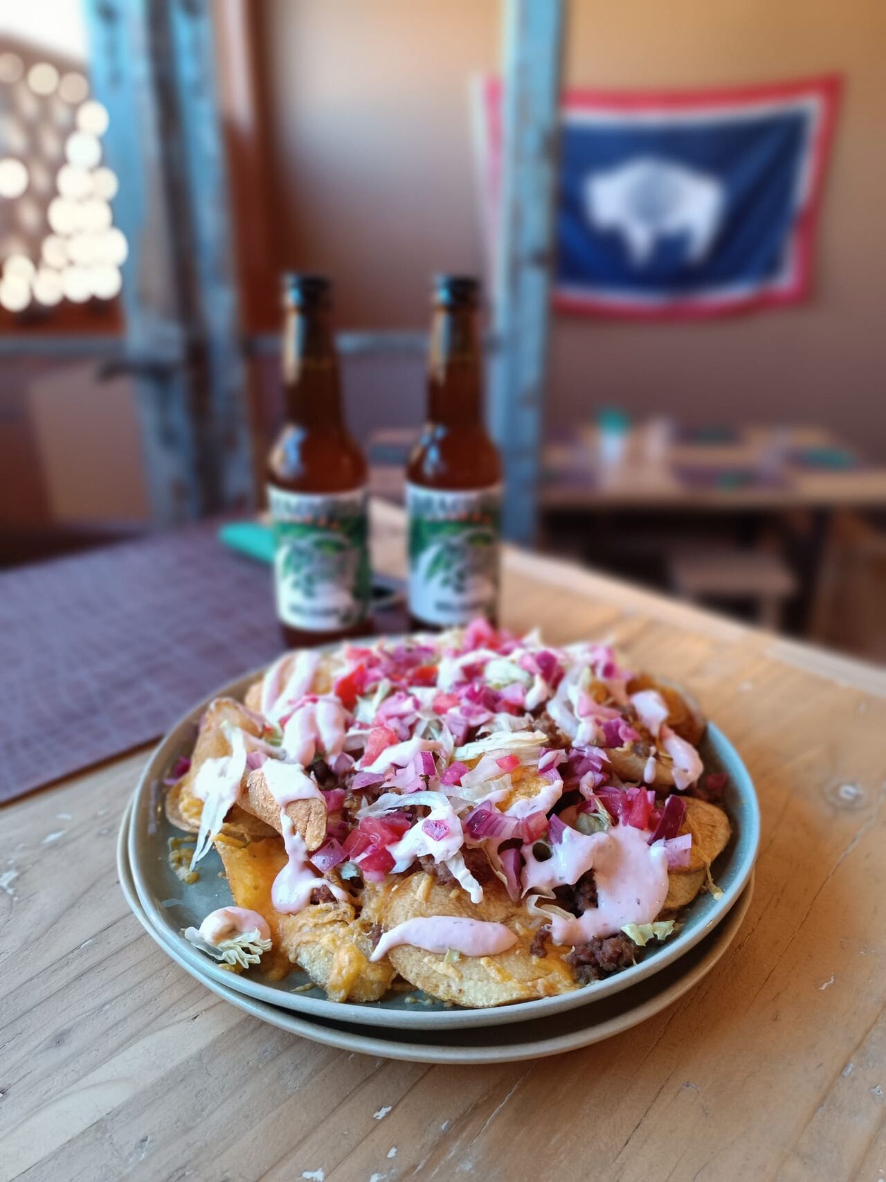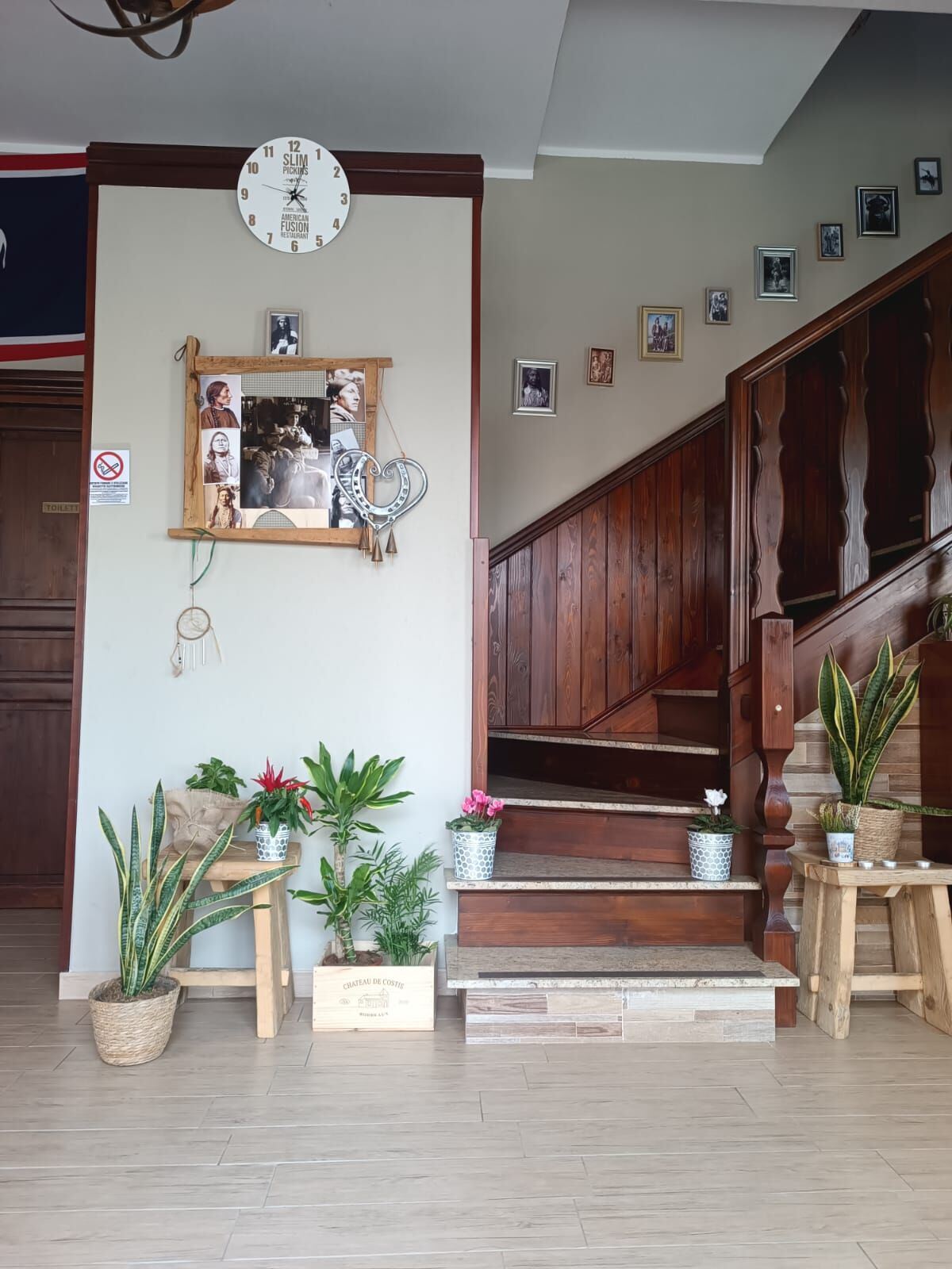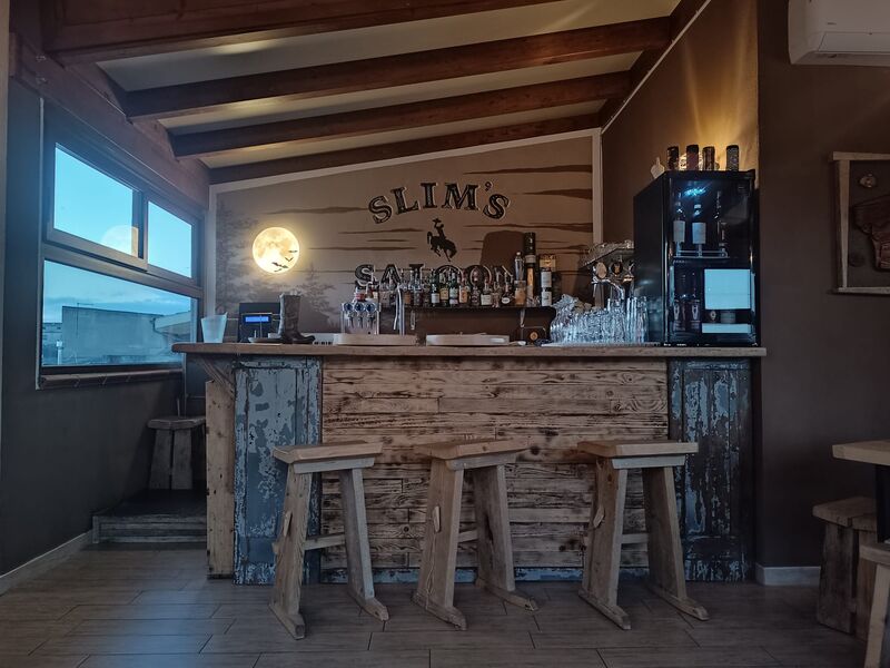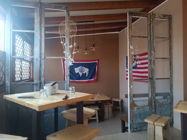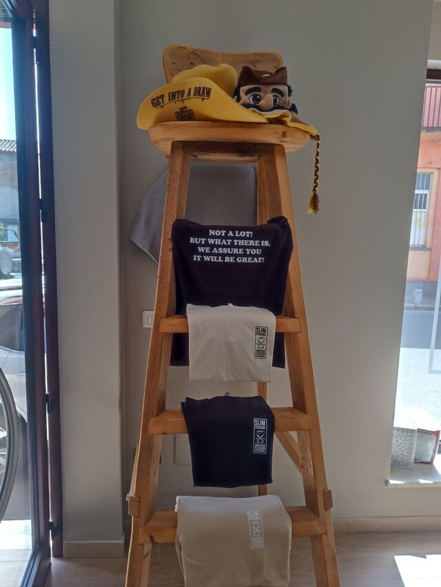 “Slim Pickins” è una frase che mio padre usava dire quando gli veniva chiesto cosa c’era per cena. Ora, è diventato non solo il nome del nostro ristorante, ma anche il nostro motto! Significa “non tantissimo, ma quello che c’è vi assicuriamo che sarà fantastico!” Abbiamo portato pezzi della mia casa in Wyoming e con essi abbiamo costruito un ristorante unico. Ogni sedia e tavolo sono stati costruiti a mano da me, Slim, e dal nostro straordinario falegname Giorgio, utilizzando legno recuperato da vecchie impalcature. Questo legno, che un tempo sosteneva uomini e donne che lavoravano duramente, ora offre un posto accogliente dove rilassarsi e godersi un pasto delizioso.